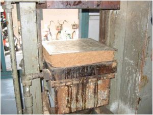 The process involves heat pressing leftover palm fibers at high pressure, setting the density at 200-400kg/cubic meters, temperature of 150 degrees Celsius, pressure of 25-30kg/cubic meter, thickness of 12.5mm. and 20mm., for 8 minutes. Then, apply 5 to 7 per cent pMDI adhesive.