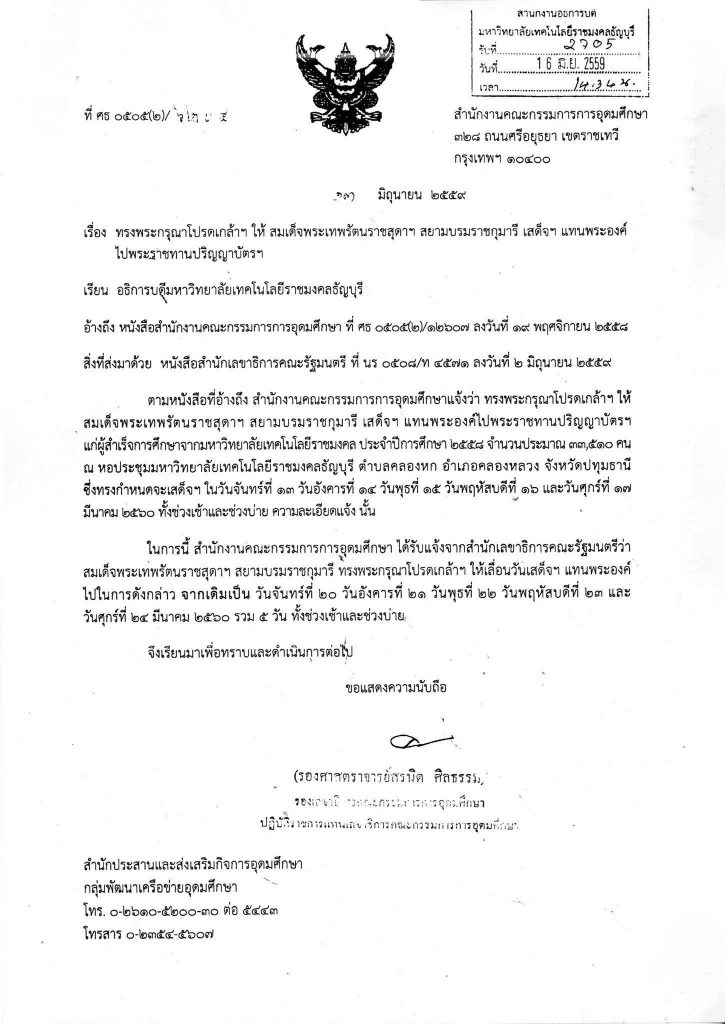 According to the Office of the Higher Education Commission (OHEC), Her Royal Highness Princess Maha Chakri Sirindhorn will replace King Maha Vajiralongkorn at RMUTT Class of 2015’s graduation ceremony to be held at RMUTT’s auditorium from Monday, March 13th to Friday, March 17th, 2017. There will be approximately 33,510 people graduating.