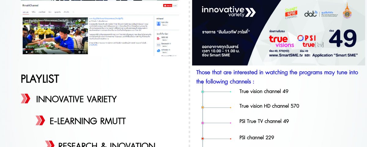 Produced by RMUTT’s Office of Academic Resource and Information Technology (ARIT) to broadcast innovations, research, and inventions of RMUTT’s professors and students and promote business to SME entrepreneurs to continuously enhance applications to business and business development efforts. On-air every Saturday from 10.00 – 11.00.