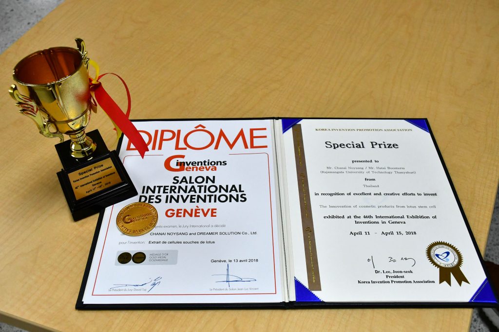 Researchers at Rajamangala University of Technology Thanyaburi (RMUTT) wins gold and special prizes at the Geneva International Research Contest Switzerland for successfully inventing the “Sacred Lotus Stem Cell” to create value of Thai medicinal plants by pointing out the benefits in skin brightening and wrinkles fading and continuing to progress into cosmetic products for both in Thailand and abroad.