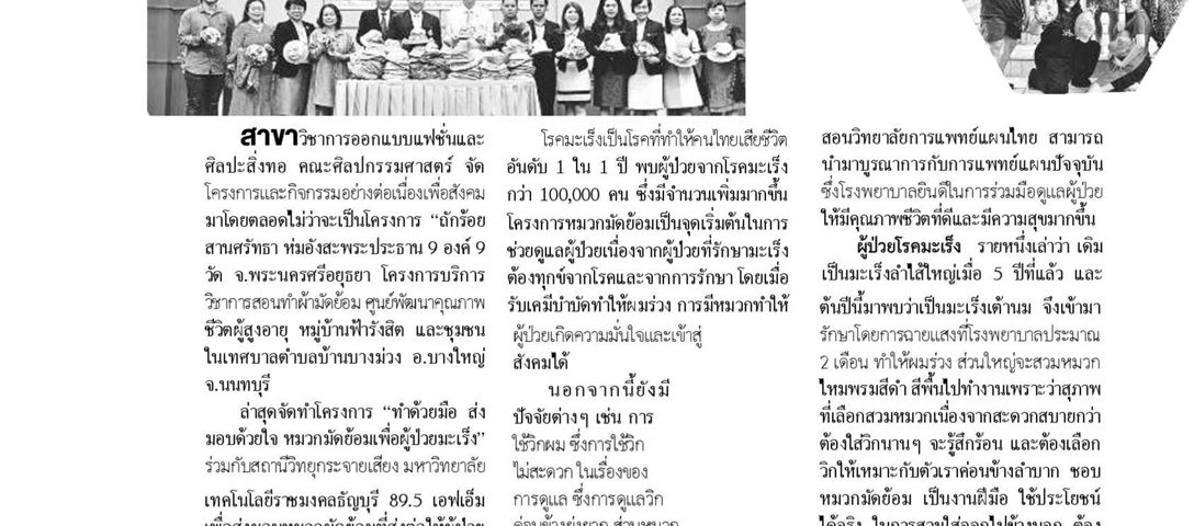 Recently, “Hand-made Tie Dye Cap made from the heart for cancer patient” project joined their hands with Rajamagala University of Technology Thanyaburi’s radio station FM 89.5 to help provide cancer patients at Maha Vajiralongkorn Thanyaburi Hospital, Bueng Sanan Subdistrict, Thanyaburi District, Pathum Thani Province and impoverished cancer patients with tie dye cap in order to avoid hot and uncomfortable of wearing a wig.