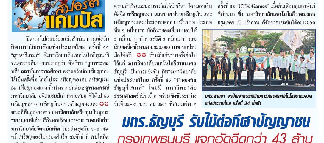 The next host for the 45th Thai University Games to be held during January 22nd – 31st, 2018 will be RMUTT. This will be the first time that the Thai University Games will be hosted by RMUTT and Srinakharinwirot University Onglarak campus, in cooperation with Thammasat University Rangsit campus. The Thai University Games will be held at both RMUTT and Thammasat University Rangsit campus. Assoc. Prof. Dr. Prasert Pinprathomrat, RMUTT President said that the budget for the Thai University Games is approximately THB 50 million.