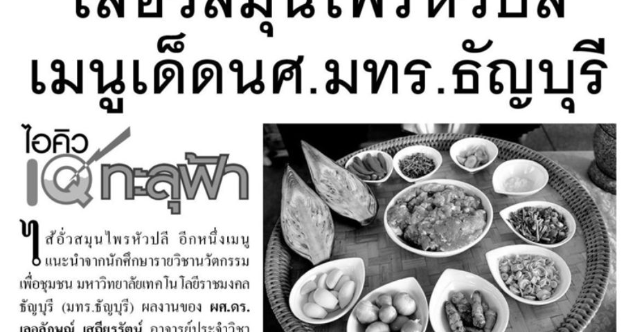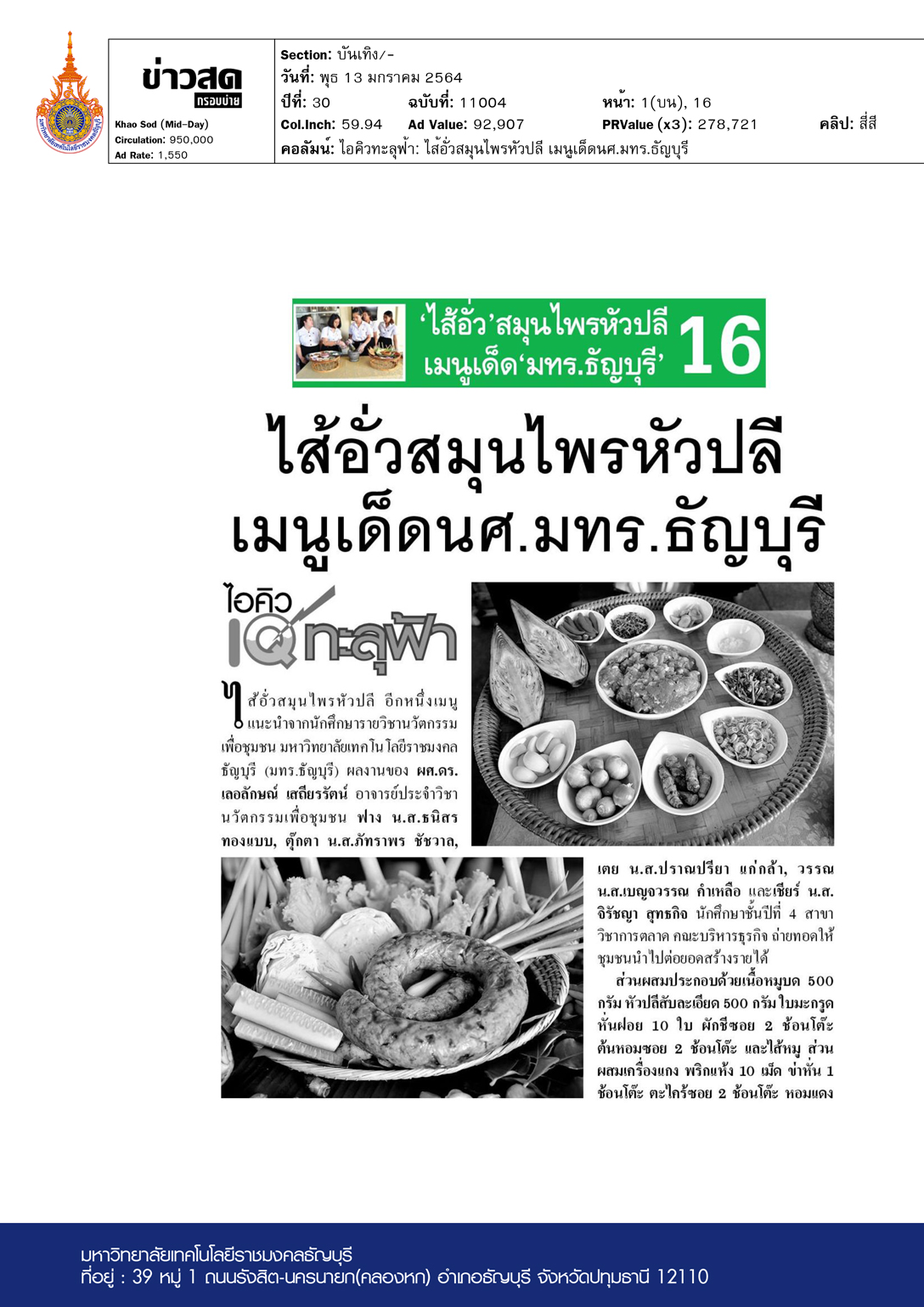 12/01/2021As part of practical learning in Innovation for Community program, RMUTT students are showing off their cookery skills making ‘Thai spicy ‘Sai ua’ sausage stuffing with herbs and banana blossom’. With close collaboration between Assistant Professor Dr. Lerluck Steinrut, Lecturer for ‘Innovation for Community’ program and her young 4th year cooking apprentices from the Faculty of Business Administration in Marketing; Ms. Thanisorn Thongbab nicknamed ‘Fang’, Ms. Pattaraporn Chuchawarn or ‘Tukta’, Ms. Pranpreeya Kaekla or ‘Toey’, Ms. Benjawan Khumleuy or ‘Wan’, and Ms. Jirutchaya Suttakit or ‘Cheer’, this exquisite dish was developed in order to extensive array of culinary skills and knowledge that will provide the cooking foundation to help community earn substantial incomes.