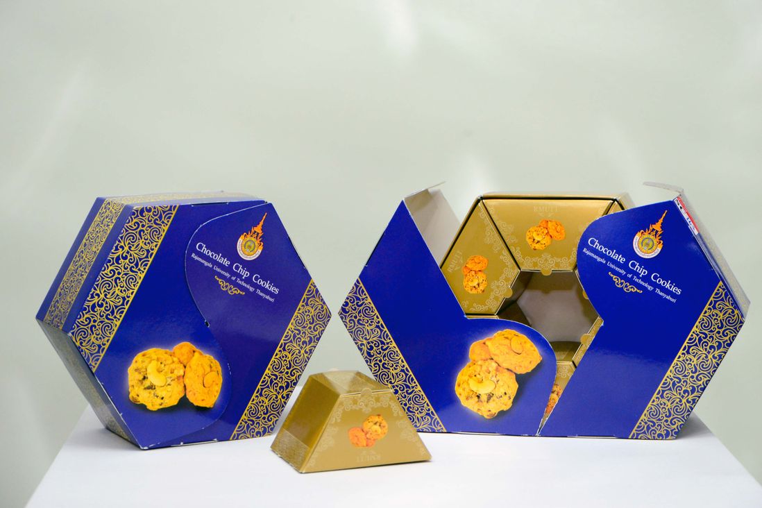 The packaging design for cookie has been designed by Mr. Suriya Srivarom and Ms. Rattanaporn Aumphijit. They are forth year’s students from product design department. They have been designed their packaging based on university’s needs which is packaging design for cookie. The concept was to use it as a gift for people in special or occasional day. She has been designed her packaging with hexagon shape and implied flower blooming feel into her packaging product show. The packaging can contain up to 6 small cookie boxes. Outer structure was strong enough to protect inside products. Blue color has been used as a primary color to represent university.